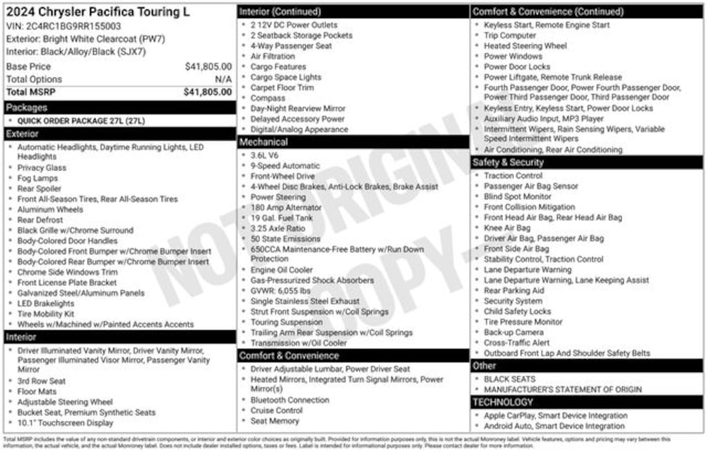 3rd row seats: split-bench, 4-Wheel Disc Brakes, 6 Speakers, ABS brakes, Air Conditioning, AM/FM radio: SiriusXM, Apple CarPlay, Apple CarPlay/Android Auto, Automatic temperature control, Black Seats, Brake assist, Caprice Leatherette Bucket Seats, Compass, Delay-off headlights, Disassociated Touchscreen Display, Driver door bin, Driver vanity mirror, Driver's Seat Mounted Armrest, Dual front impact airbags, Dual front side impact airbags, Electronic Stability Control, Four wheel independent suspension, Front anti-roll bar, Front Bucket Seats, Front dual zone A/C, Front fog lights, Front reading lights, Fully automatic headlights, Google Android Auto, GPS Antenna Input, Heated door mirrors, Heated front seats, Heated steering wheel, Illuminated entry, Integrated Active Noise Cancellation, Integrated Center Stack Radio, Knee airbag, Low tire pressure warning, Manufacturer's Statement of Origin, Memory seat, Occupant sensing airbag, Outside temperature display, Overhead airbag, Overhead console, Panic alarm, ParkView Rear Back-Up Camera, Passenger door bin, Passenger seat mounted armrest, Passenger vanity mirror, Power door mirrors, Power driver seat, Power Liftgate, Power steering, Power windows, Quick Order Package 27L, Radio data system, Radio: Uconnect 5 w/10.1" Display, Rear air conditioning, Rear reading lights, Rear window defroster, Reclining 3rd row seat, Remote keyless entry, Security system, Split folding rear seat, Steering wheel mounted audio controls, Tachometer, Telescoping steering wheel, Tilt steering wheel, Traction control, Trip computer, USB Host Flip, Voltmeter.