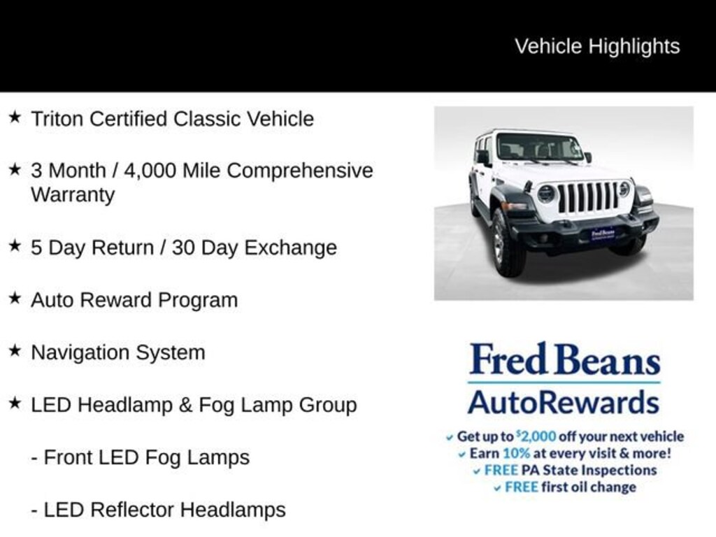 As a Triton Certified Classic Vehicle, this 2020 Jeep Wrangler Unlimited Freedom Edition has undergone a rigorous inspection and reconditioning process, ensuring it meets the highest standards of quality and reliability. With a 3-month/4,000-mile comprehensive warranty and a 5-day return/30-day exchange policy, you can purchase with confidence, knowing you're getting a vehicle that's built to last.