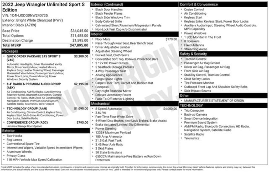 The 2022 Jeep Wrangler Unlimited Sport S comes equipped with an impressive array of technology and convenience features:
