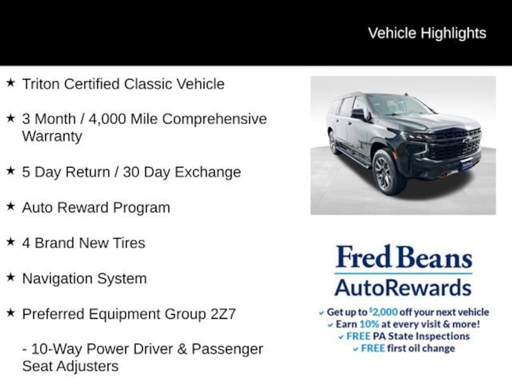 This Triton Certified Classic Vehicle comes with a comprehensive 3-Month/4,000-Mile warranty, giving you peace of mind and confidence in your purchase. With its impressive performance, premium features, and exceptional value, the 2024 Chevrolet Suburban Z71 is the ultimate SUV for those who demand the best.